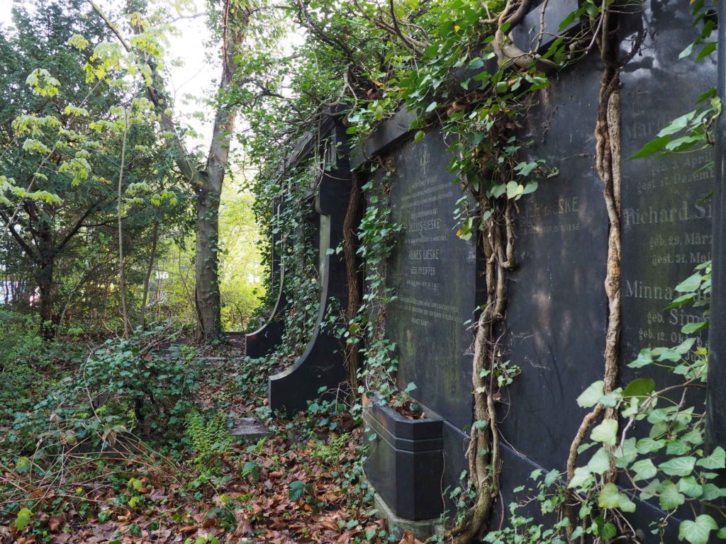 Normalerweise würde ich aus Pietätsgründen keine Grabsteine fotografieren, aber da es sich ja hier um eine Parkanlage handelt, denke ich geht das in Ordnung. Die Menschen laufen mit ihren Hunden durch den Park, die Hunde laufen zwischen den Grabsteinen. Es ist alles sehr ungewöhnlich, aber irgendwie interessant und sogar schön.